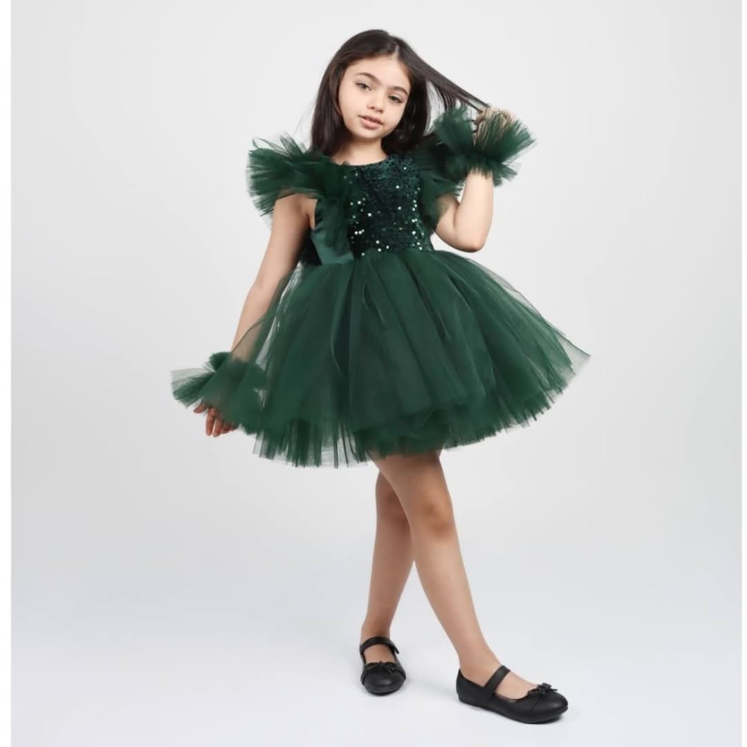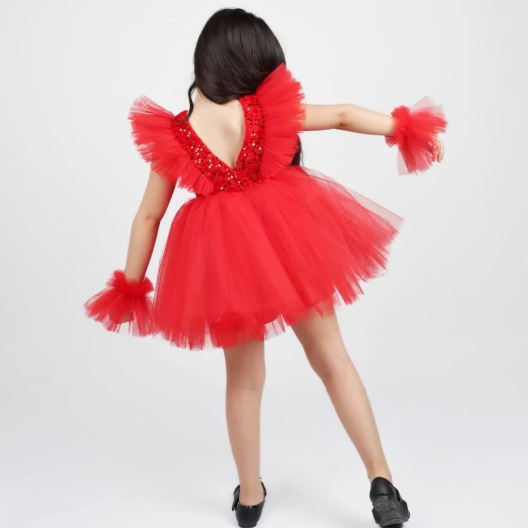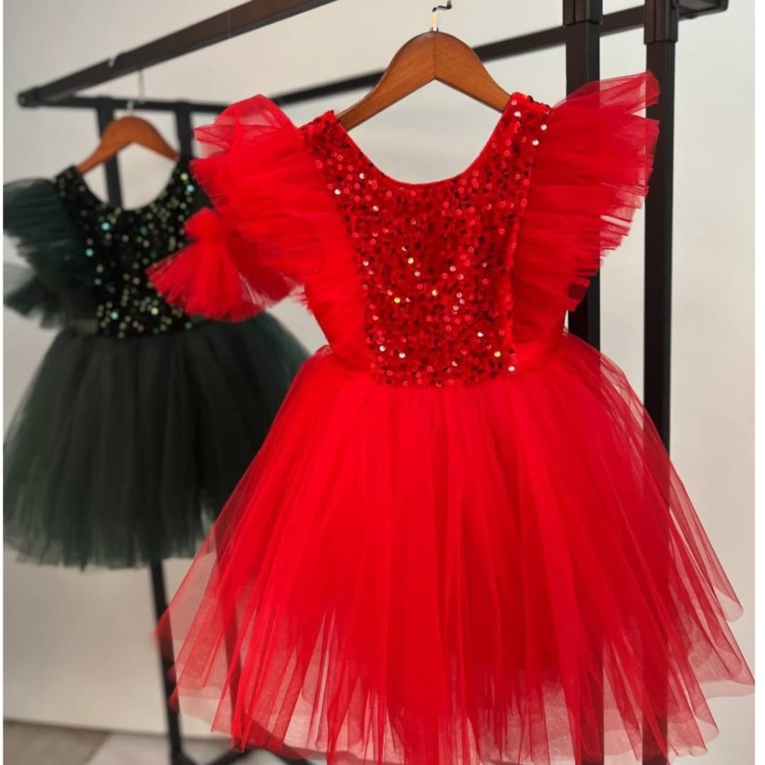 سارافن پرنسسی با جنس بالاتنه دو مدل پارچه، پولک سبز و قرمز و پارچه ساتن امریکایی. قسمت یقه نوار مغزی دوزی شده و جنس استر تافته است. همراه با دو عدد ساق کوتاه تور.