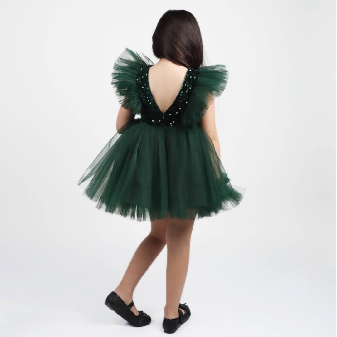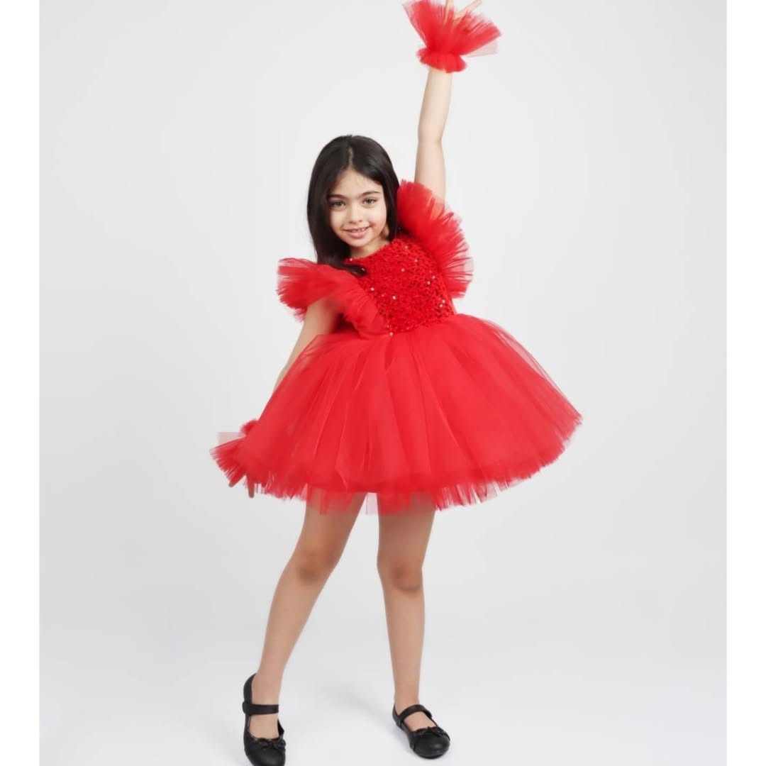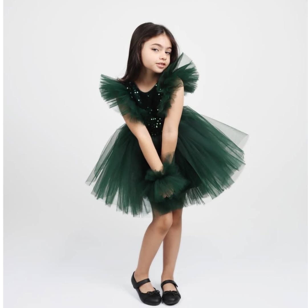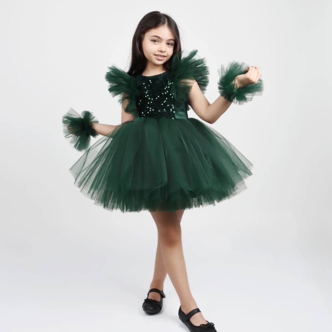 سارافن پرنسسی با جنس بالاتنه دو مدل پارچه، پولک سبز و قرمز و پارچه ساتن امریکایی. قسمت یقه نوار مغزی دوزی شده و جنس استر تافته است. همراه با دو عدد ساق کوتاه تور.