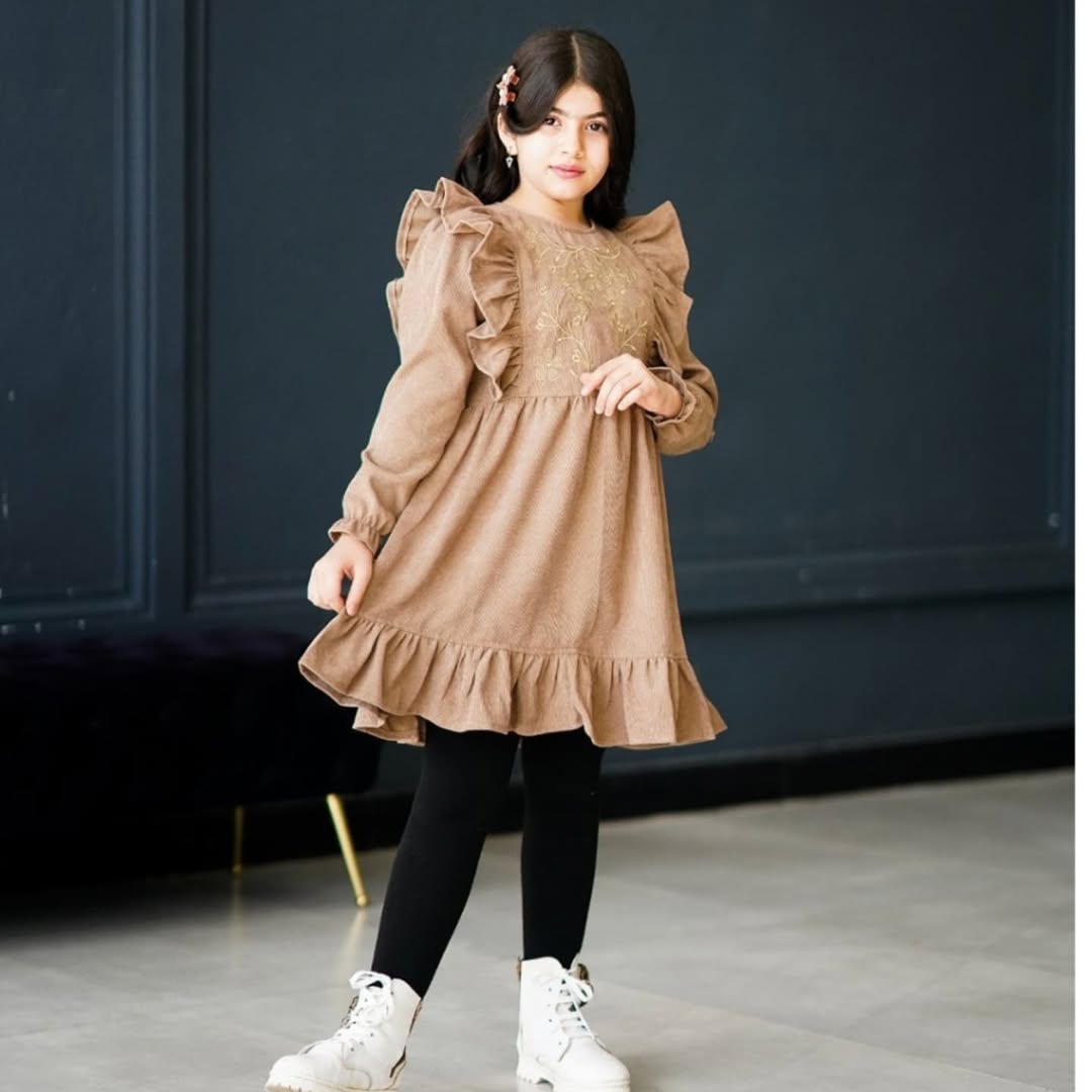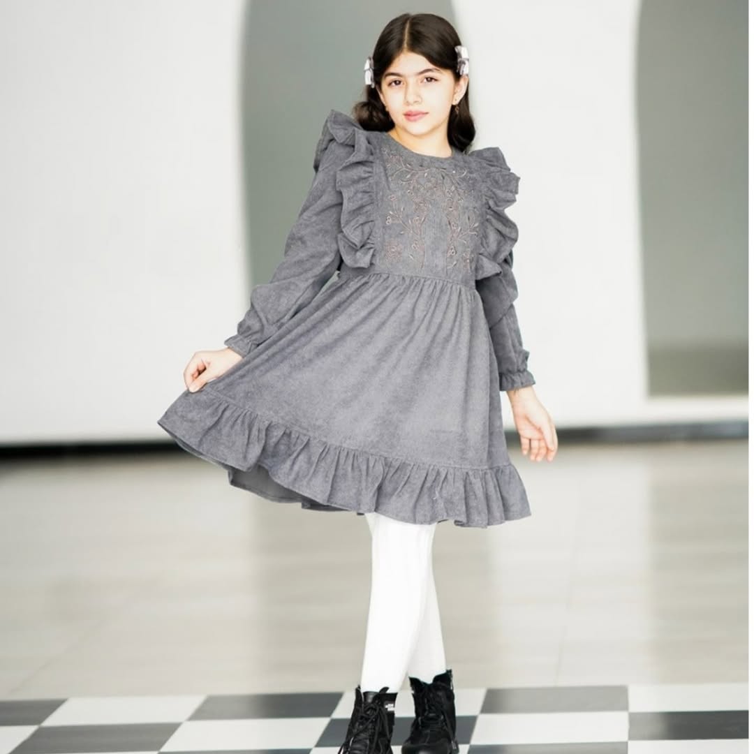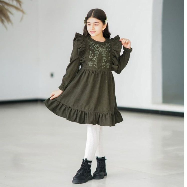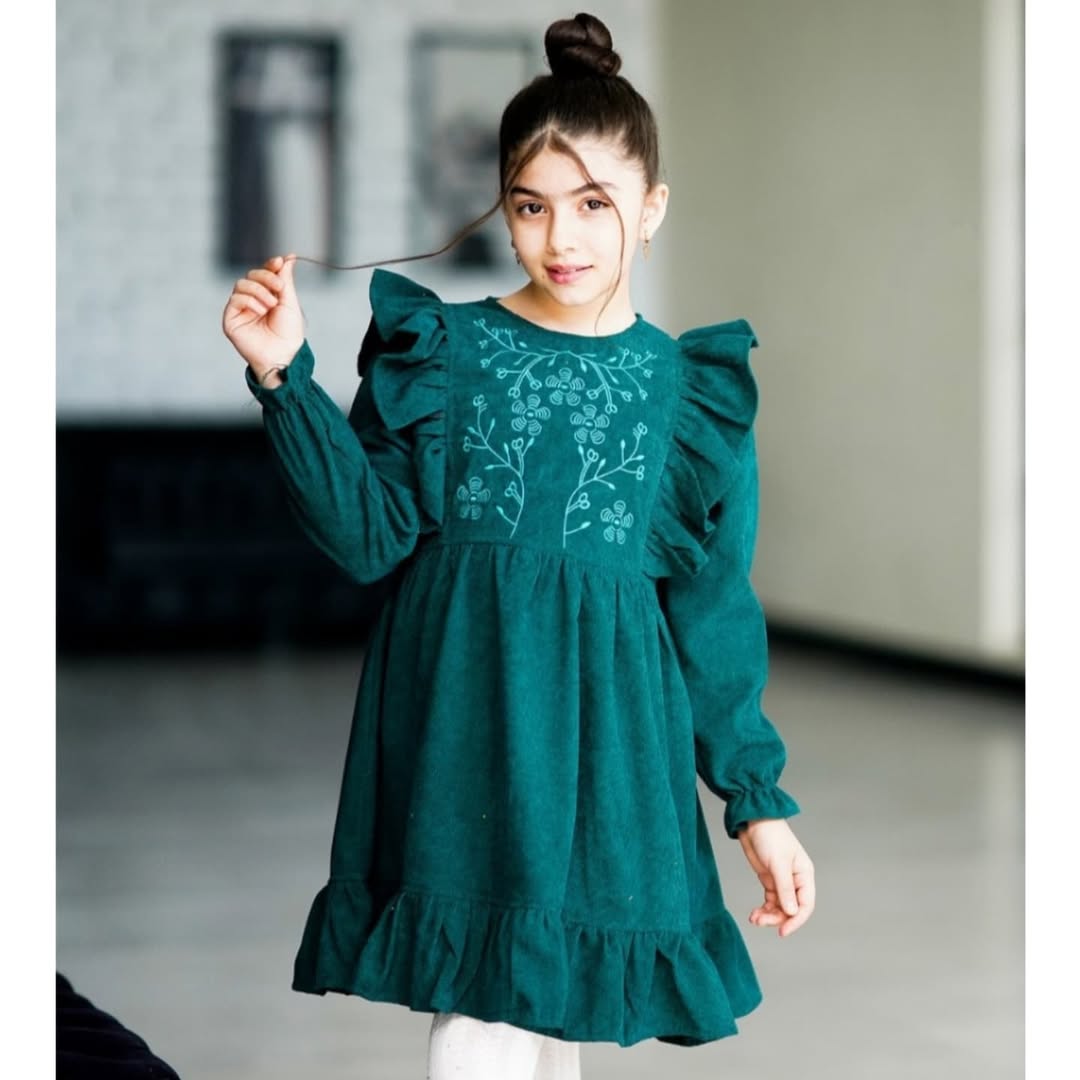 این سارافون زیبا با طراحی گلدوزی شده و جنس پارچه مخمل بدون رنگدهی و پرزدهی، مناسب برای سنین ۷ تا ۱۲ سال است.