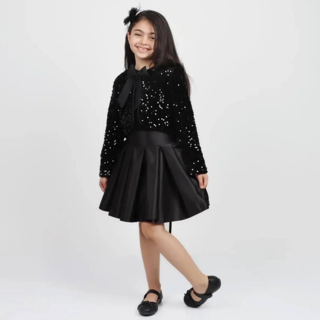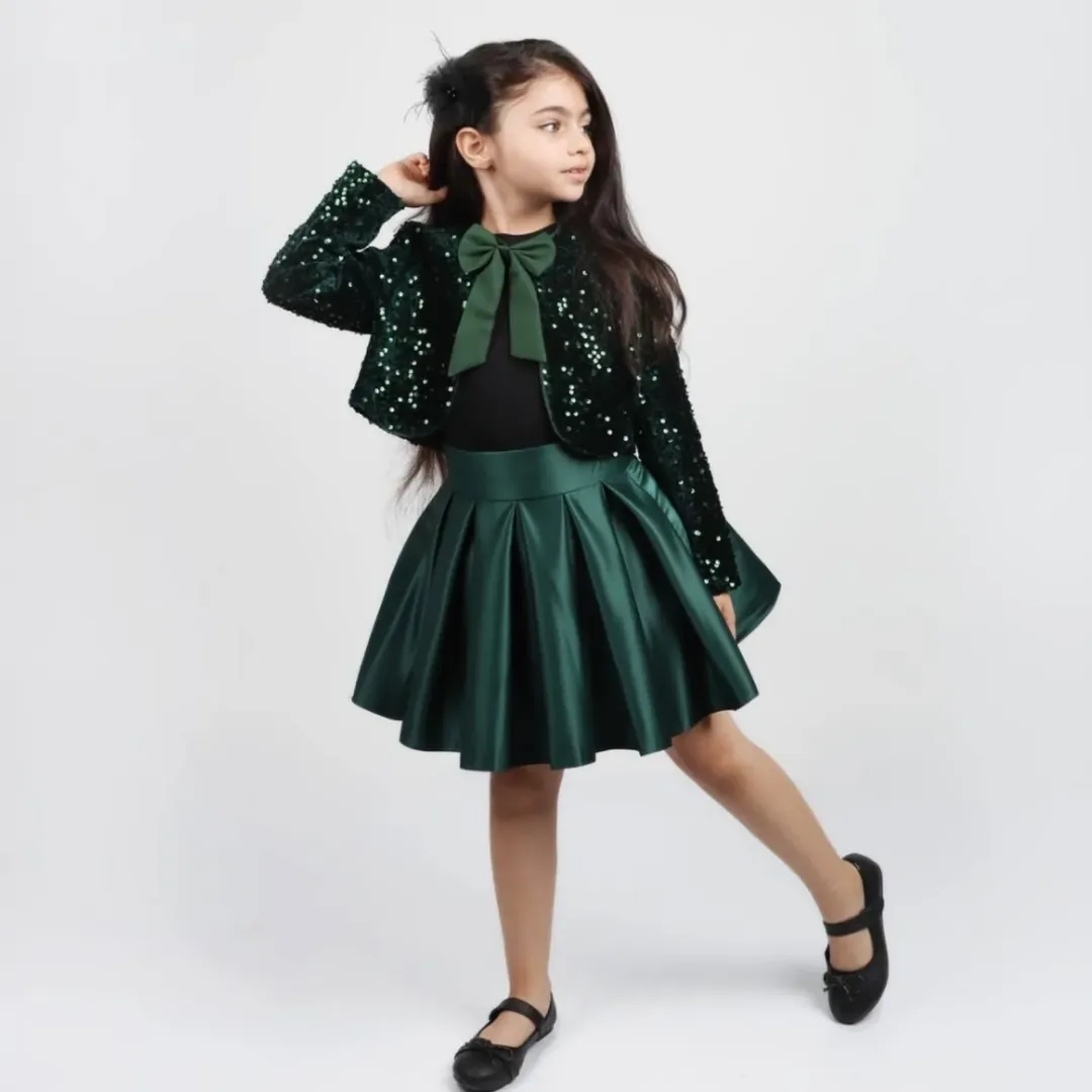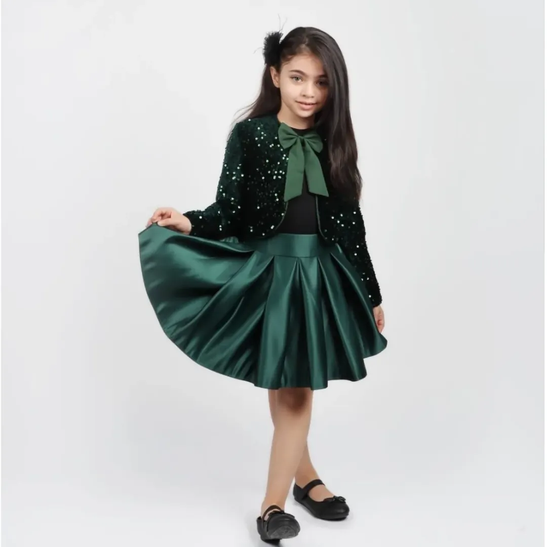 کت پولکی جنس پارچه پولک دو طرف کش جنس استر پونژه اکسسوری پاپیون جلوی لباس رنگبندی مشکی سفید سبز مناسب سن 12سال