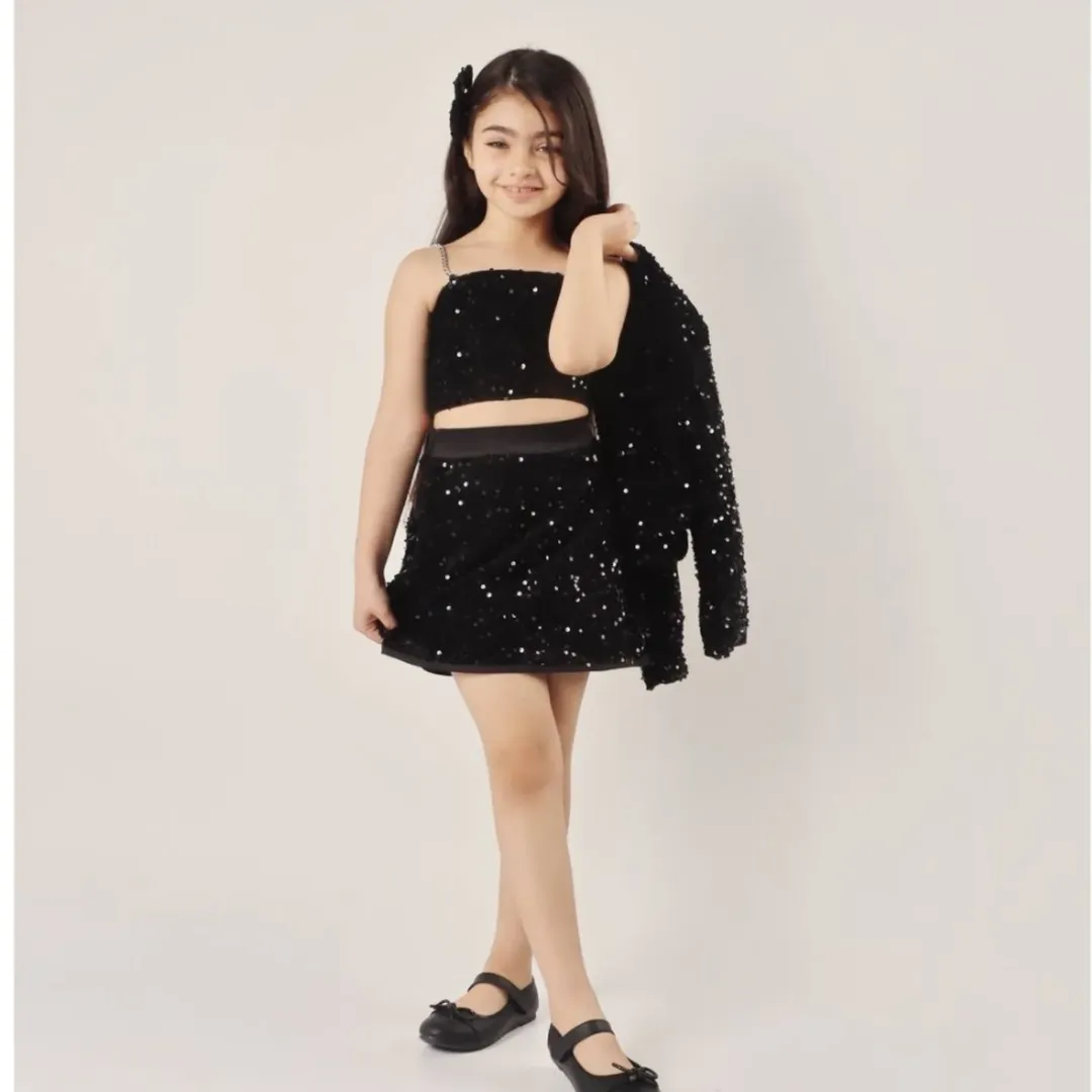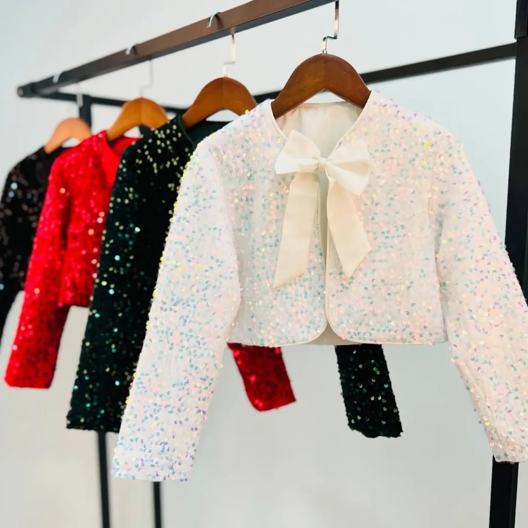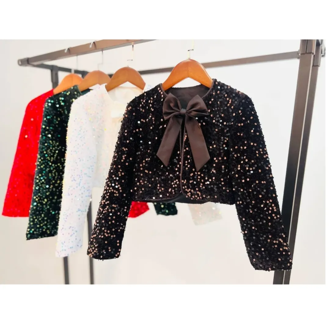 کت پولکی جنس پارچه پولک دو طرف کش جنس استر پونژه اکسسوری پاپیون جلوی لباس رنگبندی مشکی سفید سبز مناسب سن 12سال