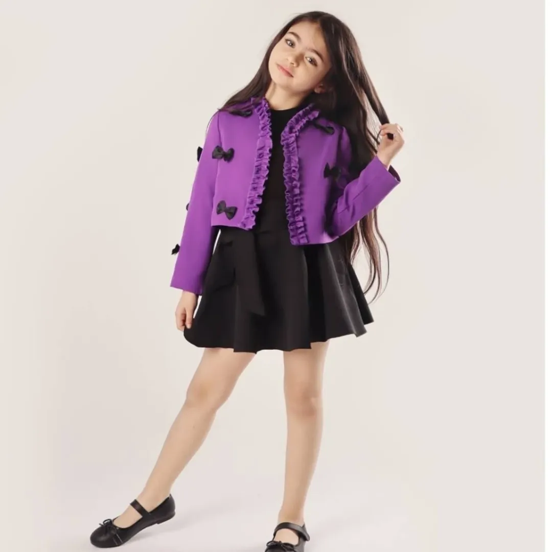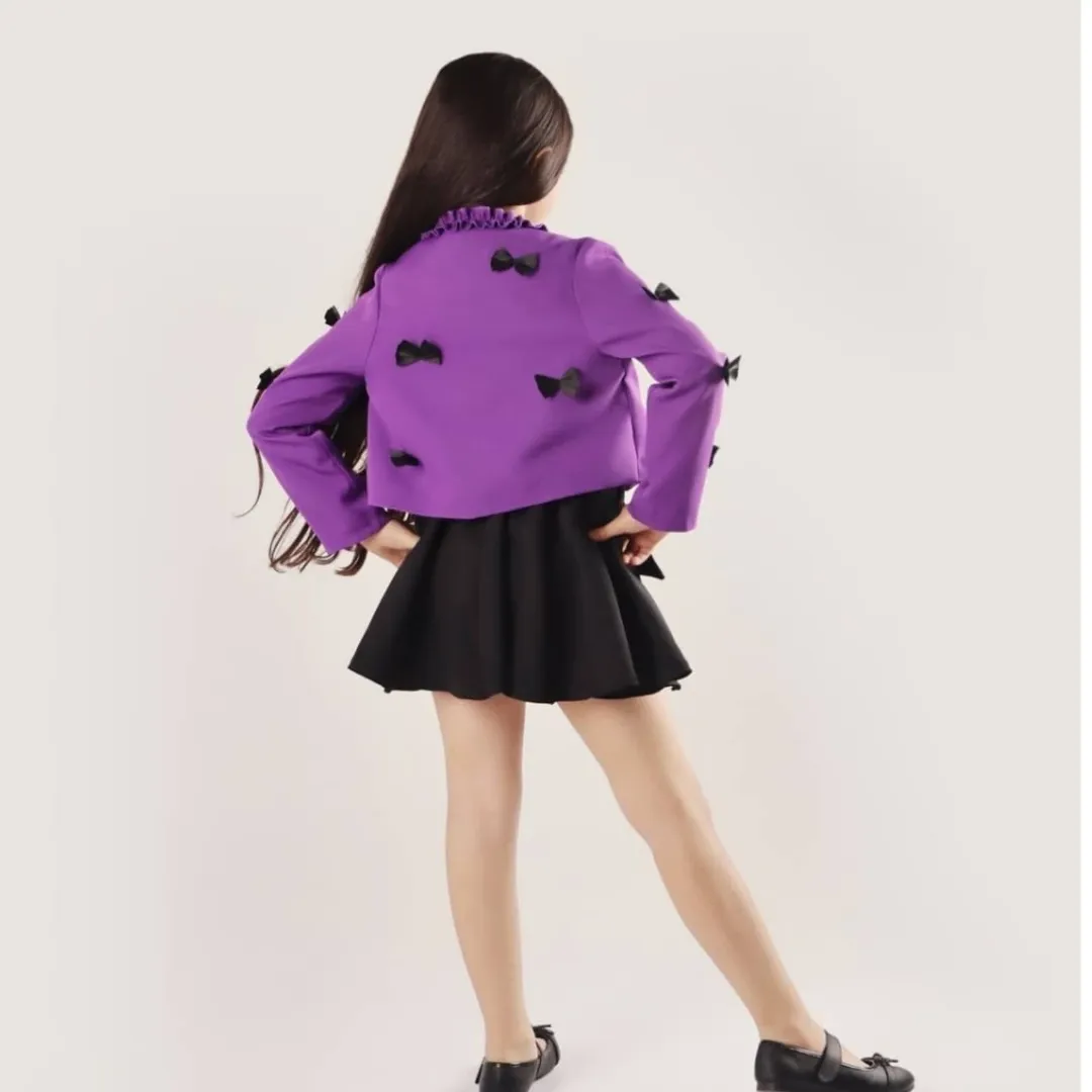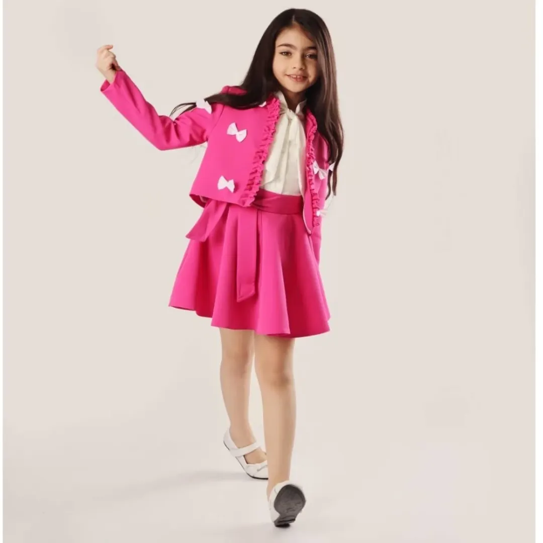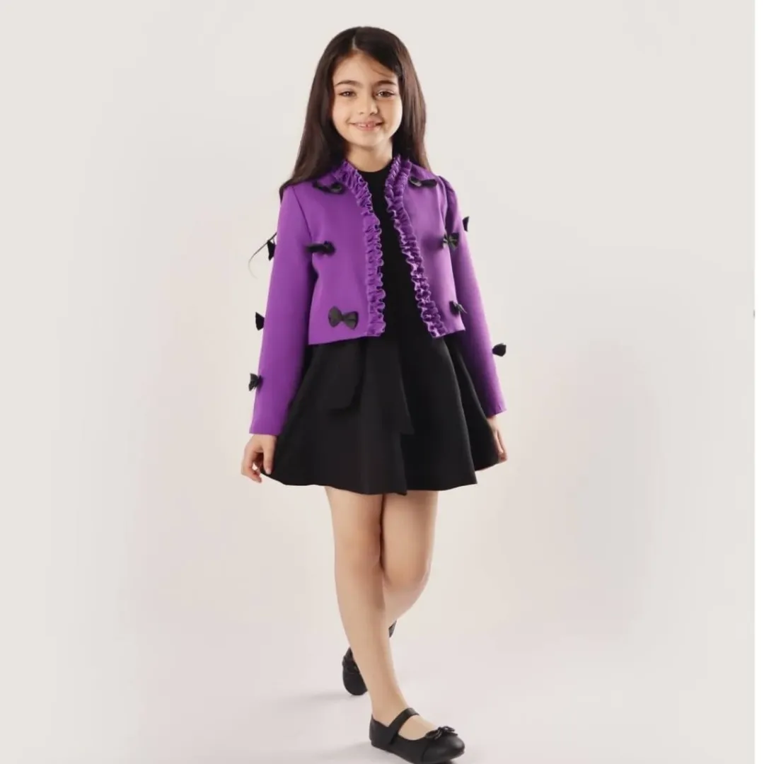 کت عروسکی آنیا جنس پارچه مازراتی جنس استر کت کراپی پونژه روی کت پاپیون دوخت شده رنگبندی: مناسب سن ۱۲ سال