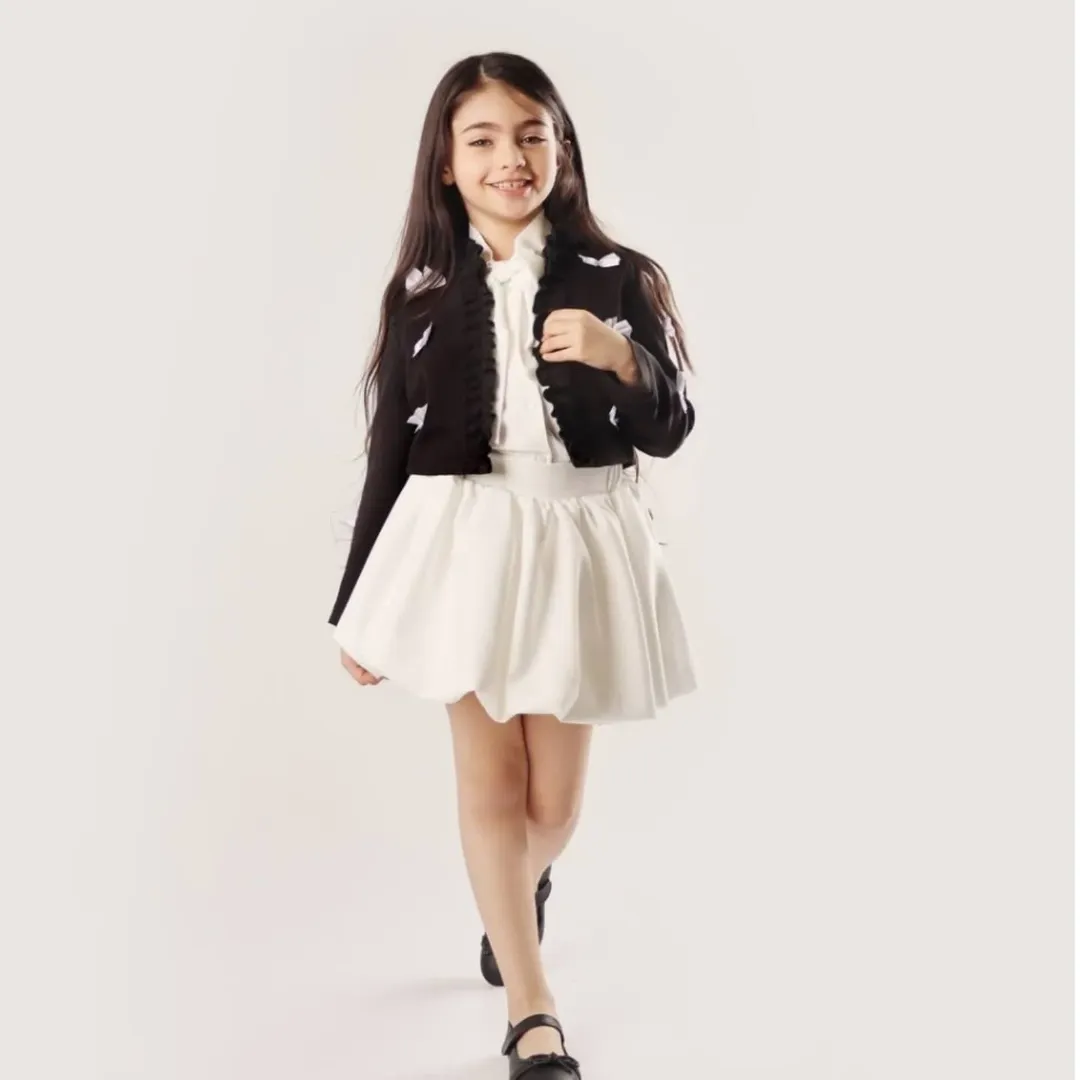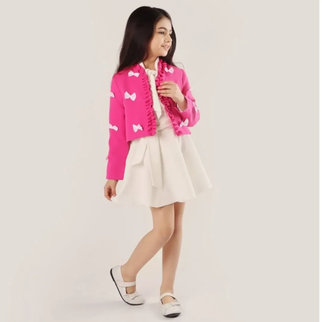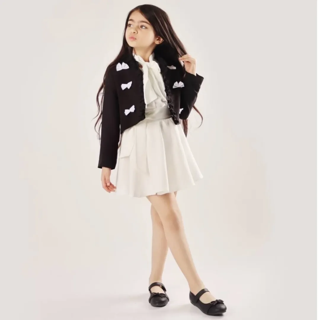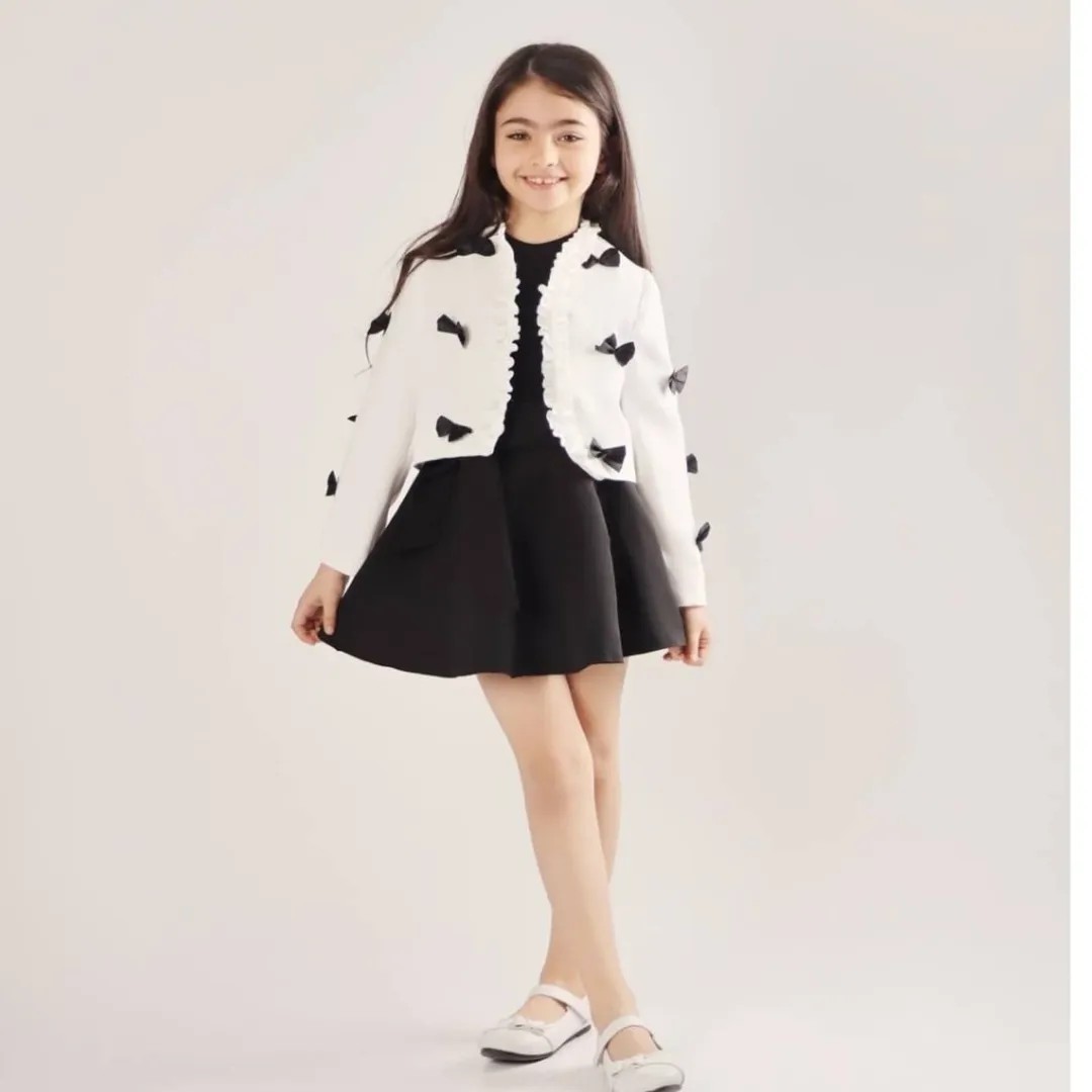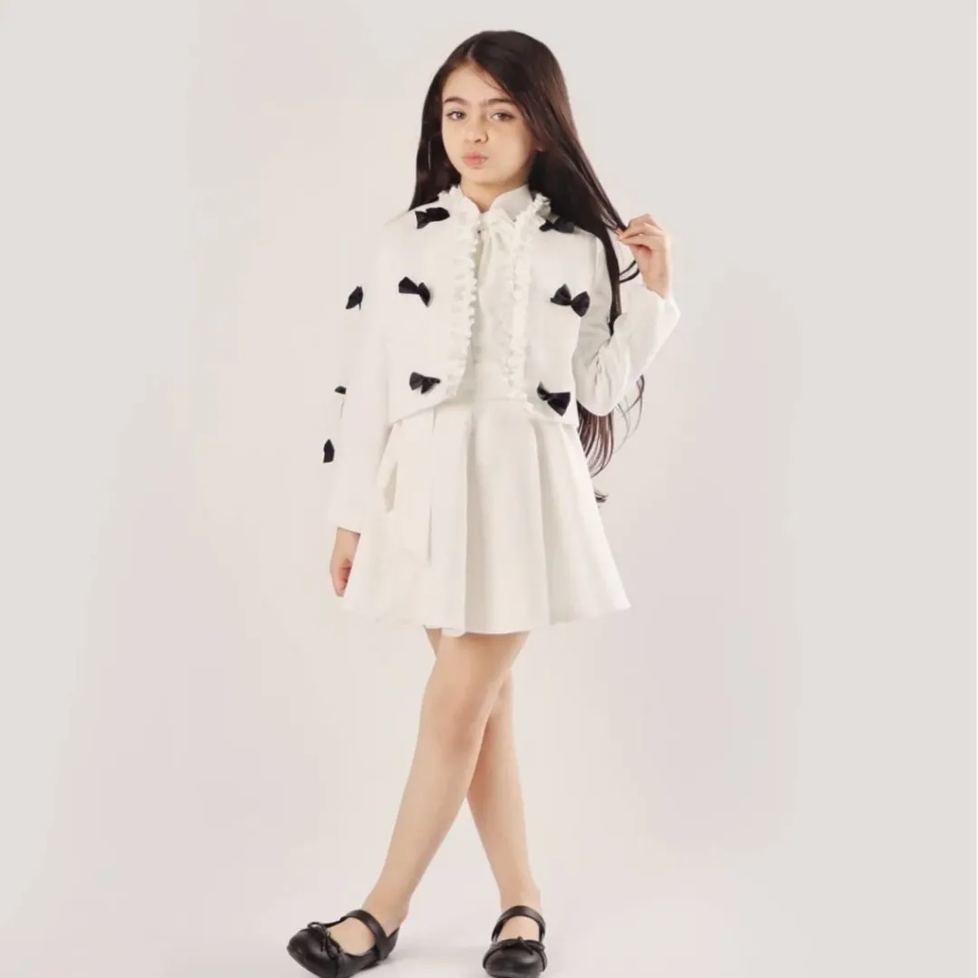 کت عروسکی آنیا جنس پارچه مازراتی جنس استر کت کراپی پونژه روی کت پاپیون دوخت شده رنگبندی: مناسب سن ۱۲ سال