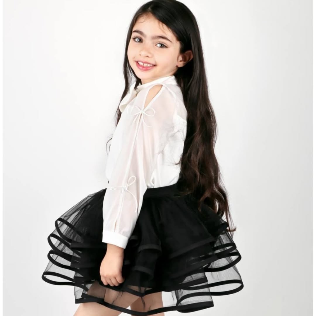 شومیز سفید دخترانه جنس کراپ مازراتی و حریر پشت تاپ با دکمه وصله شده قسمت استین پاپیون از جنس نخ ماکارونی دوخت شده تک رنگ مناسب سن ۱۲ سال.
